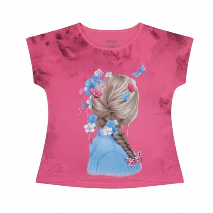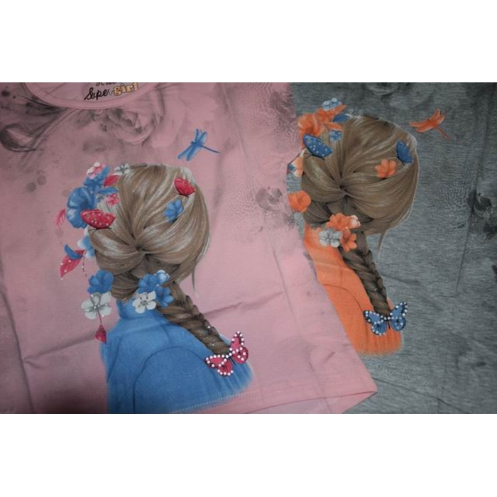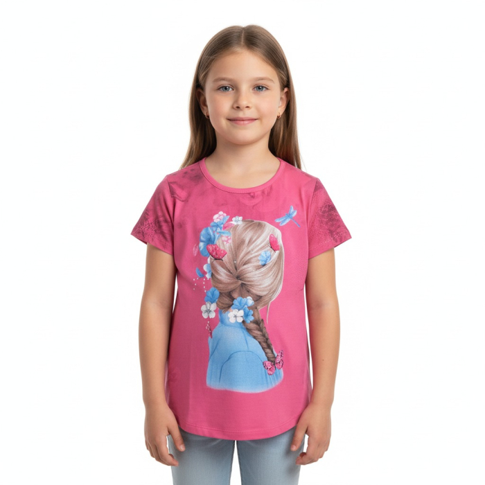 Dívčí letní tričko zdobené obrázkem holčičky s copánkem a motýlky