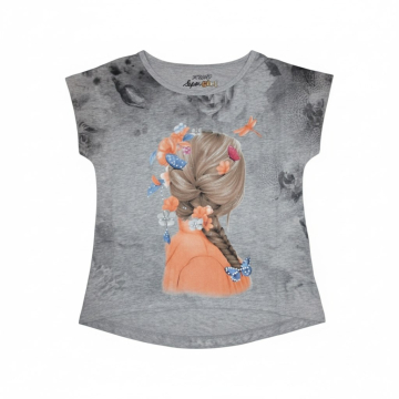 Dívčí letní tričko zdobené obrázkem holčičky s copánkem a motýlky