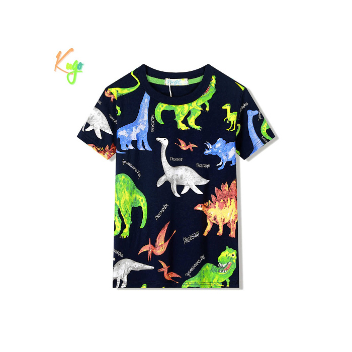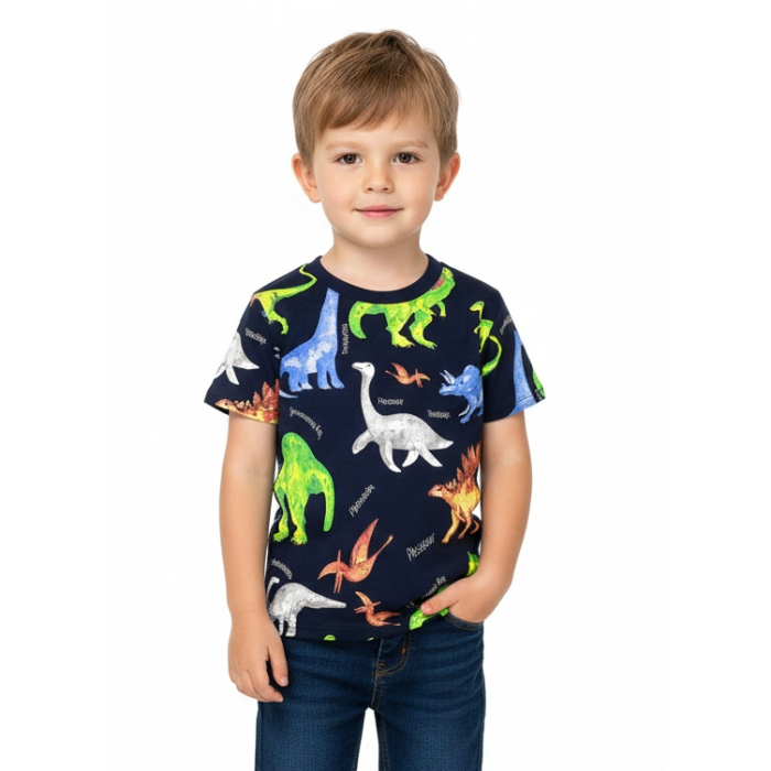 Toto pohodlné letní tričko s krátkým rukávem zdobí pestrobarevní dinosauři na přední i zadní straně