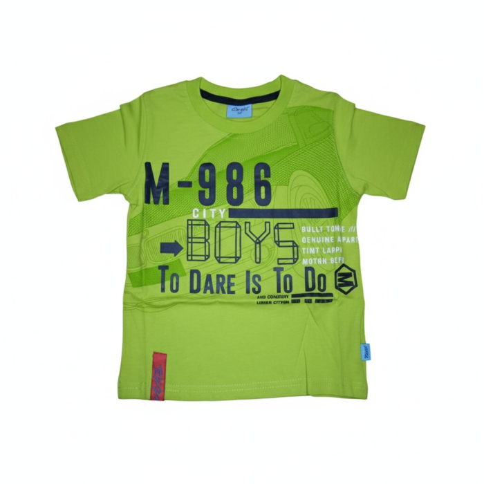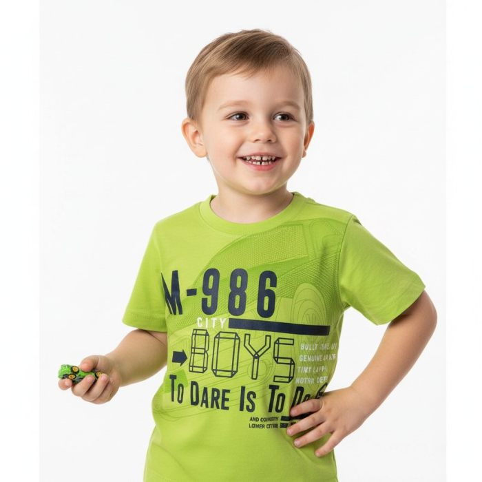 Chlapecké letní tričko s krátkým rukávem, s nápisem v pozadí auto