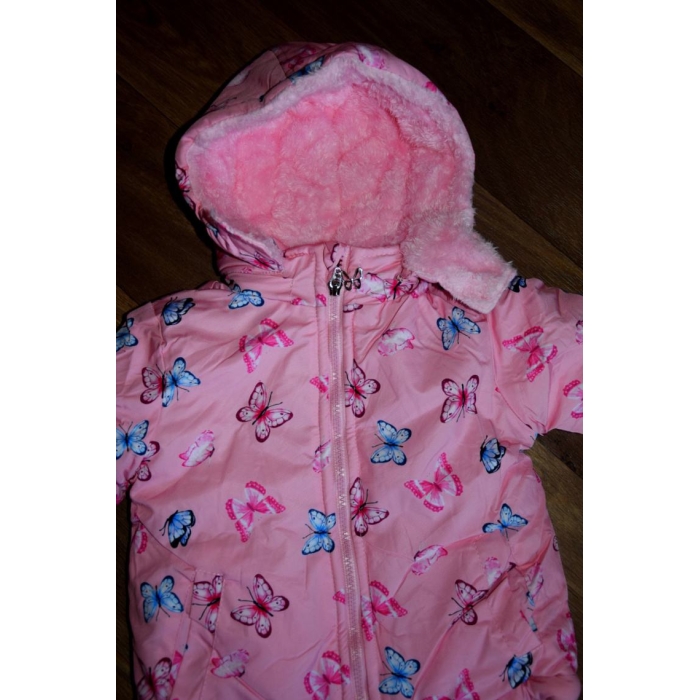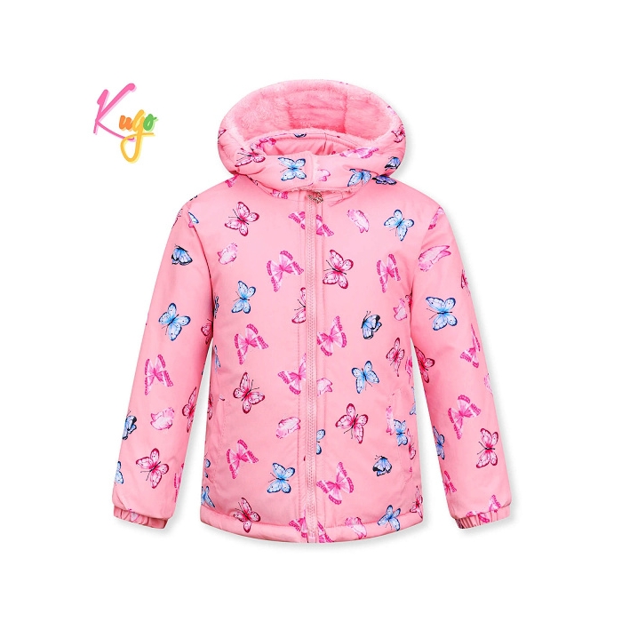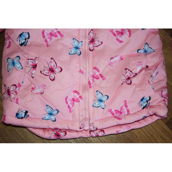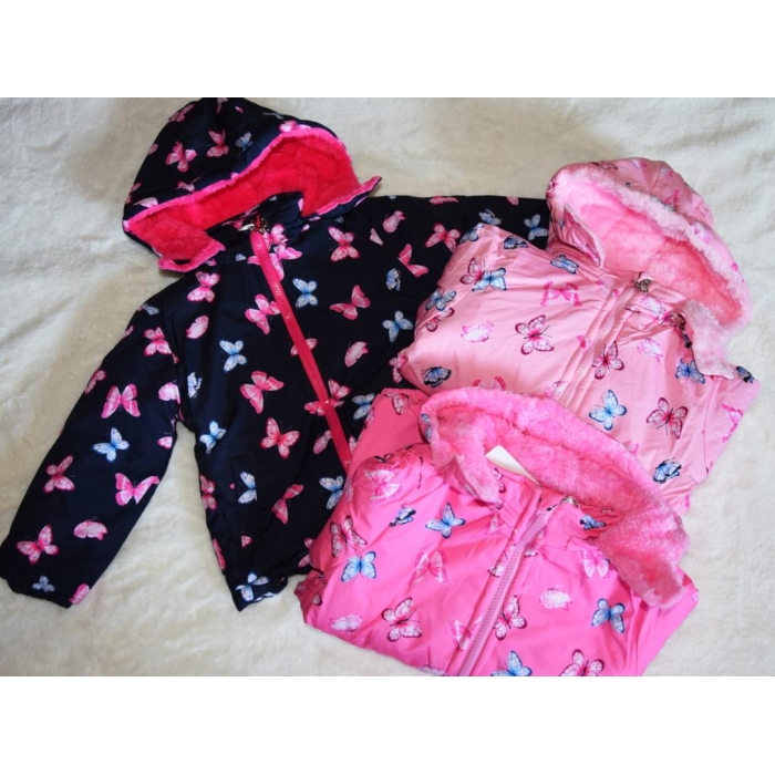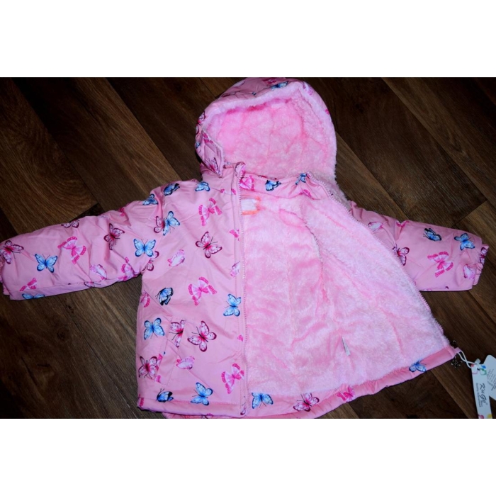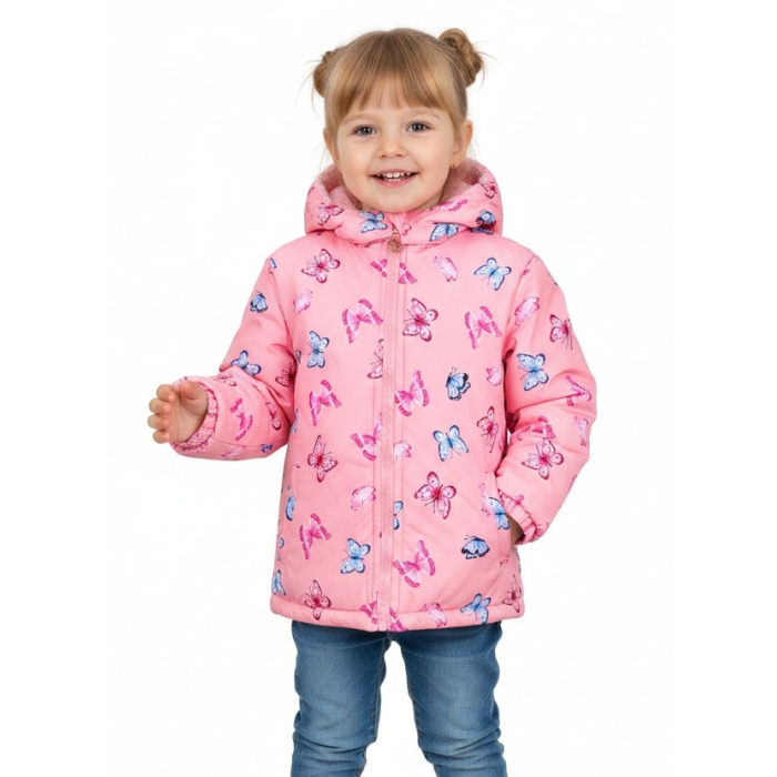 Tato roztomilá bunda s jemnými motýlky spojuje hřejivý komfort s praktickými detaily, které ocení každý rodič.