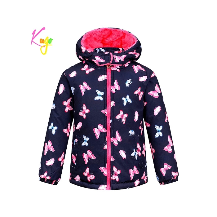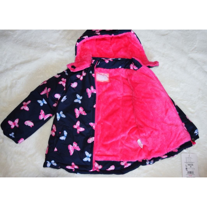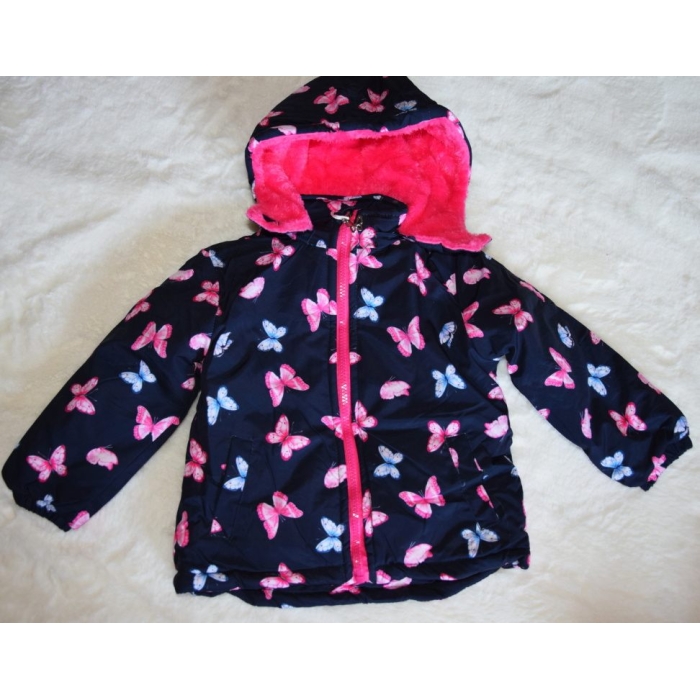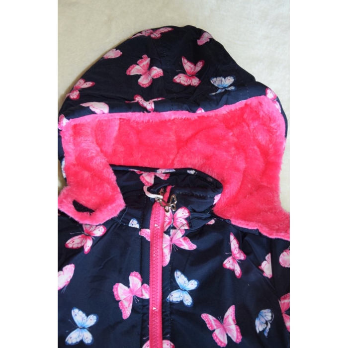 Tato roztomilá bunda s jemnými motýlky spojuje hřejivý komfort s praktickými detaily, které ocení každý rodič.