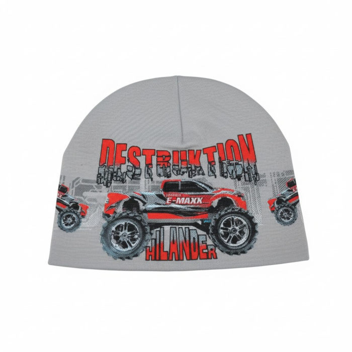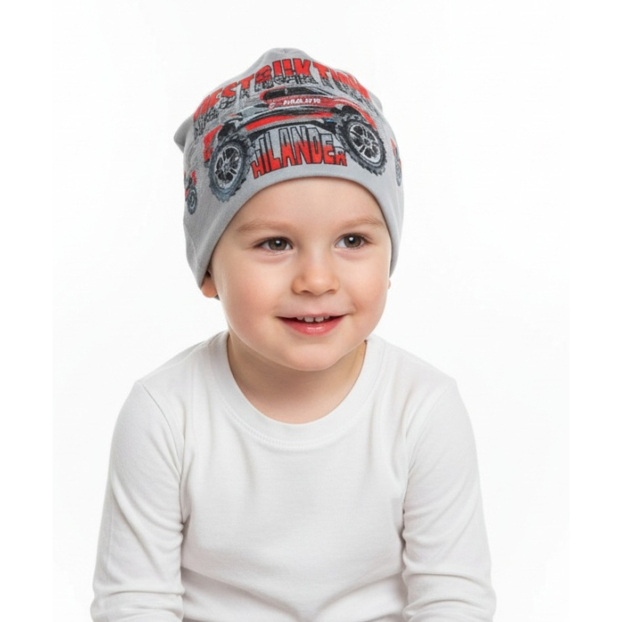 Jarní chlapecká čepice s motivem terénního auta, která je ideální pro malé dobrodruhy.
