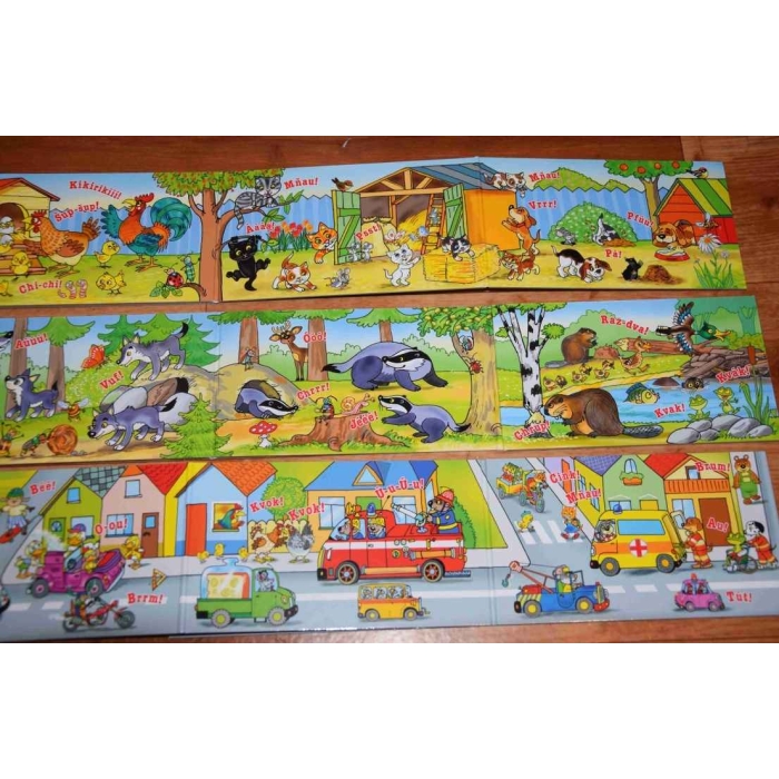 Krásná rozkládací leporela pro nejmenší. Při popisu ilustrací si dítě rozvíjí základní slovní zásobu a zábavnou formou se učí, jak se zvířátka a stroje jmenují ...