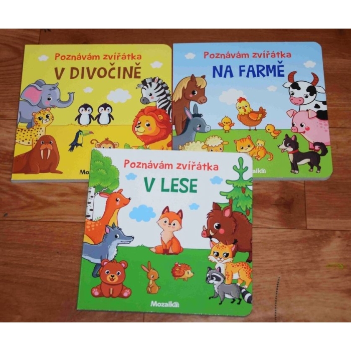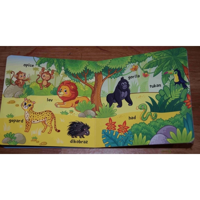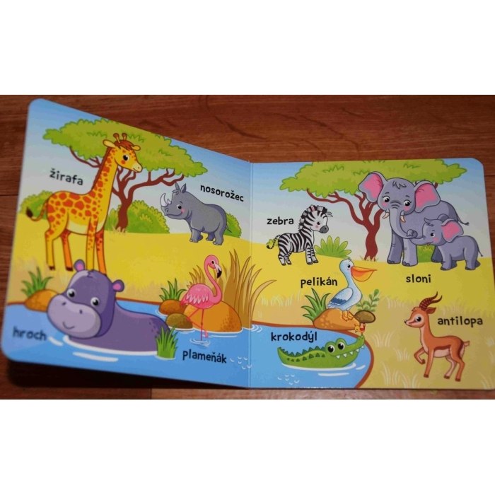 Obrázkové leporelo, ve kterém děti poznávají zvířátka v divočině, na farmě a v lese.