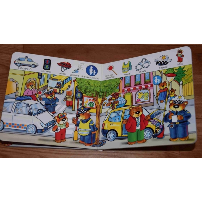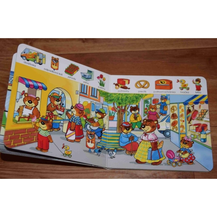Seznamte se s medvídkem Míšou a hledáním obrázků poznejte život ve městě.