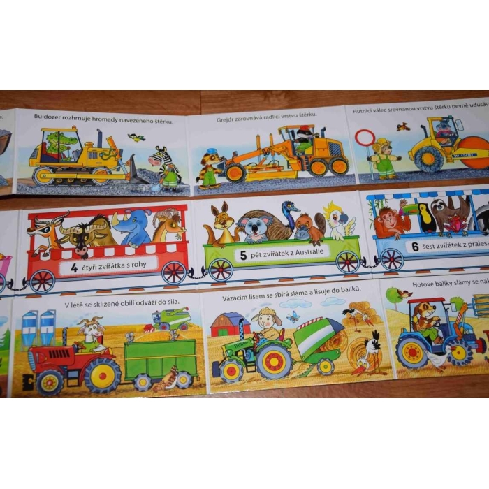 Krásná rozkládací leporela pro nejmenší. Při popisu ilustrací si dítě rozvíjí základní slovní zásobu a zábavnou formou se učí, jak se zvířátka a stroje jmenují ...